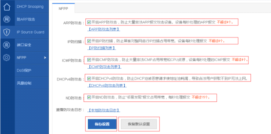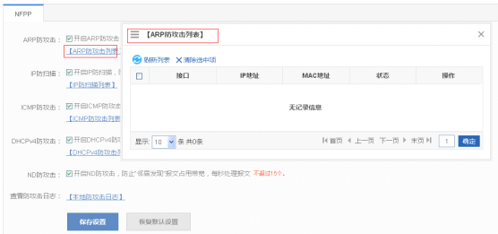 默认设备打开ARP防攻击、IP防扫描、ICMP防攻击、DHCPV4防攻击、ND防攻击。