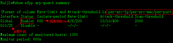 Ruijie(config-nfpp)#arp-guard isolate-period 600 ------>超过ARP攻击阀值后,对用户进行隔离,设置隔离时间为600秒