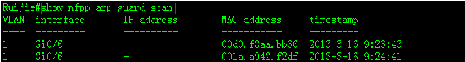 Ruijie(config-nfpp)#arp-guard rate-limit per-src-mac 20 ------>每个mac每秒限速6个arp报文,多余的ARP报文将被丢弃(默认限速阀值是4个)