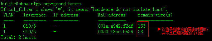 nfpp arp-guard hosts命令可以查看被隔离的用户信息,不打*标记的用户表示已经被硬件隔离成功。